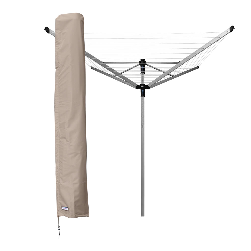 Als u lang gebruik wilt maken van uw droogmolen dan is dit de perfecte beschermhoes. Deze hoes houdt uw droogmolen en waslijnen schoon en droog. Wij weten namelijk dat niets zo ergerlijk is als zwarte streepjes op uw witte wasgoed. De droogmolenhoes is gemaakt van stevig en dik materiaal, te vergelijken met het materiaal van een sporttas. Dit materiaal klappert niet in de wind. De kleur van de hoes is taupe, een zeer neutrale kleur in niet zal opvallen in uw tuin.