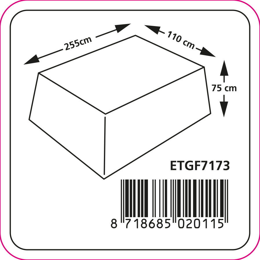 Deze hoes uit de nieuwe EuroTrail Cantonic collectie is 255 x 110 cm en 75 cm hoog. Deze hoes is geschikt voor een tuintafel van maximaal 255 x 105 cm of 250 x 110 cm. Is uw tuintafel groter? Dan is de ETGF7175 wellicht een betere keuze.