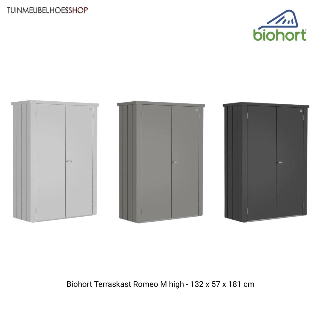 De Romeo Buitenkast is leverbaar in de bekende Biohort-kleuren: zilver metallic, kwartsgrijs metallic en donkergrijs metallic.