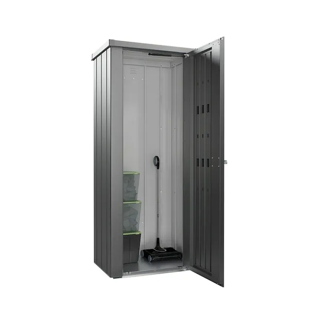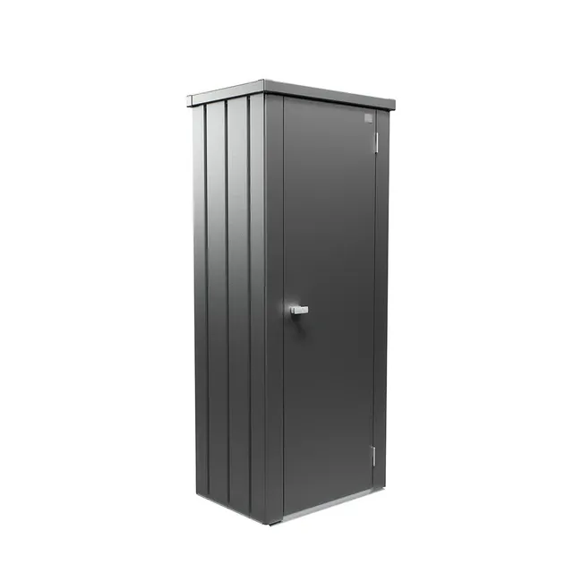 Enkele deur met gasveer voor comfortabele opening, legplank, ophangsysteem aan de binnenzijde van de deur inclusief haken, 2-voudige vergrendeling met cilinderslot, geïntegreerde ventilatie en een regenwaterdichte, onderhoudsvrije constructie. |