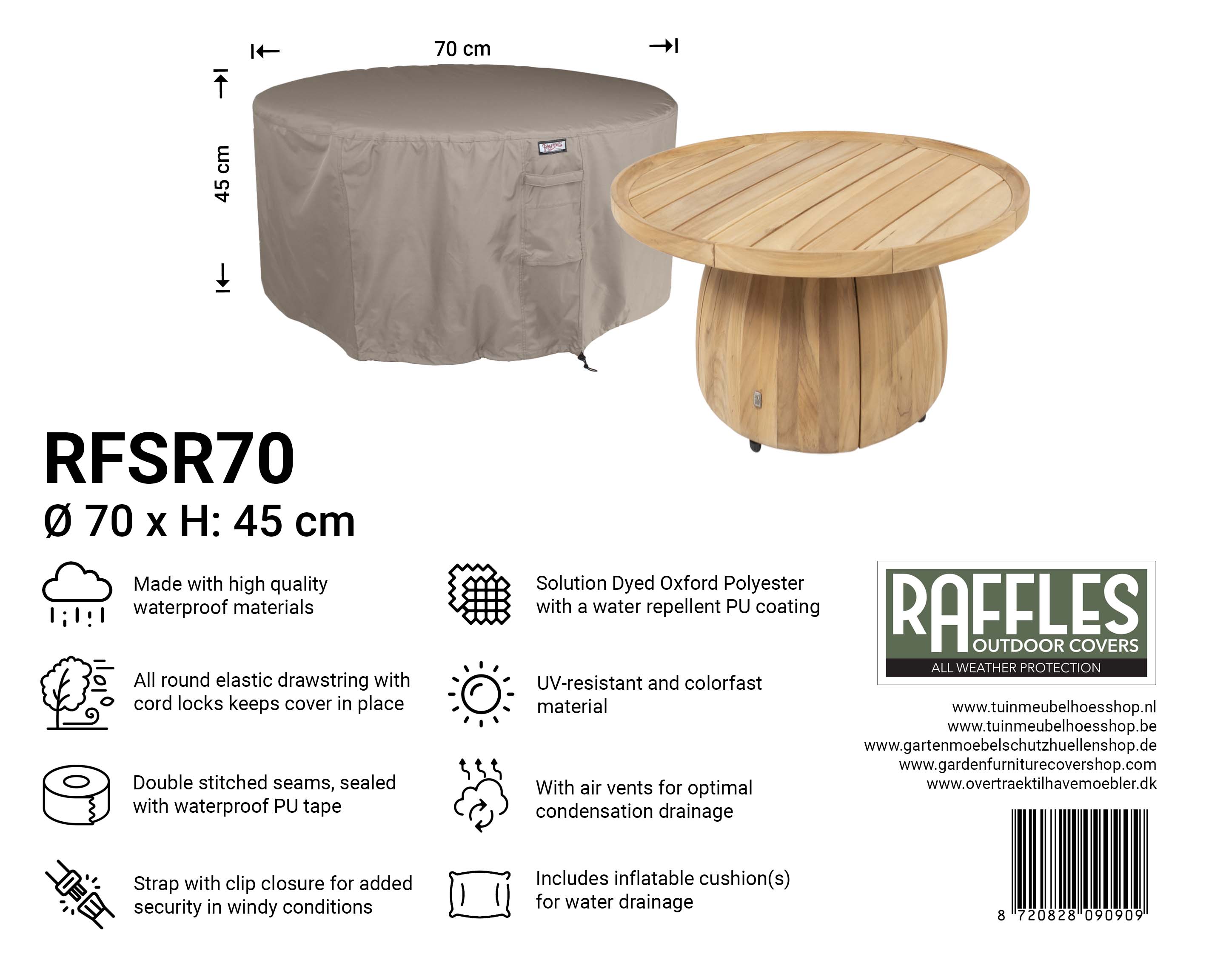 De RFSR70 beschermhoes is speciaal ontworpen voor ronde loungetafels met een diameter van 70 cm. Dankzij de nauwkeurige pasvorm is extra speling niet nodig.