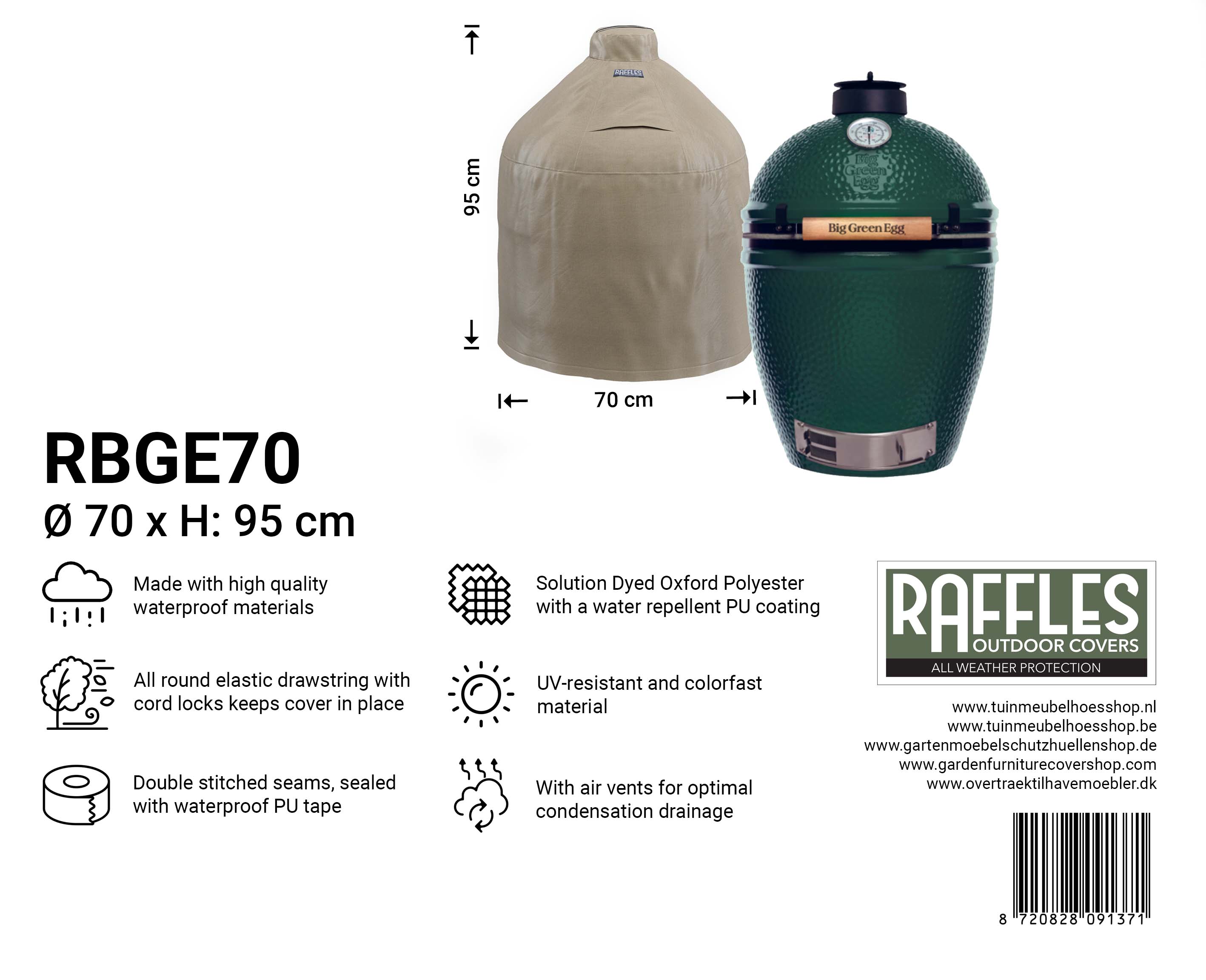 De RBGE70 beschermhoes is geschikt voor kamado-barbecues met een maximale omtrek van 220 cm. De hoes biedt voldoende ruimte voor scharnieren, handvatten en eventuele zijtafels, zolang de totale omtrek binnen de gestelde maat blijft.