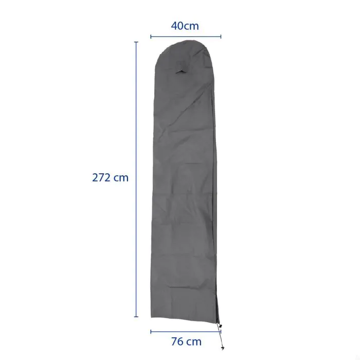 De parasolhoes is 272 cm lang, boven plat gemeten 40 cm, onder plat gemeten 76 cm.