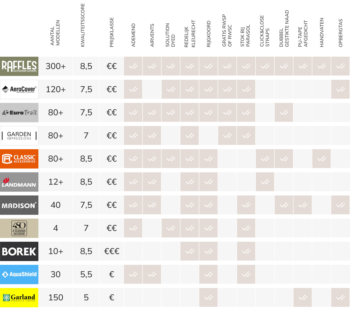In de onderstaande tabel hebben wij alle hoezen naast elkaar gezet, zodat u gemakkelijk in een oogopslag kunt zien welke specificaties de verschillende merken hebben.