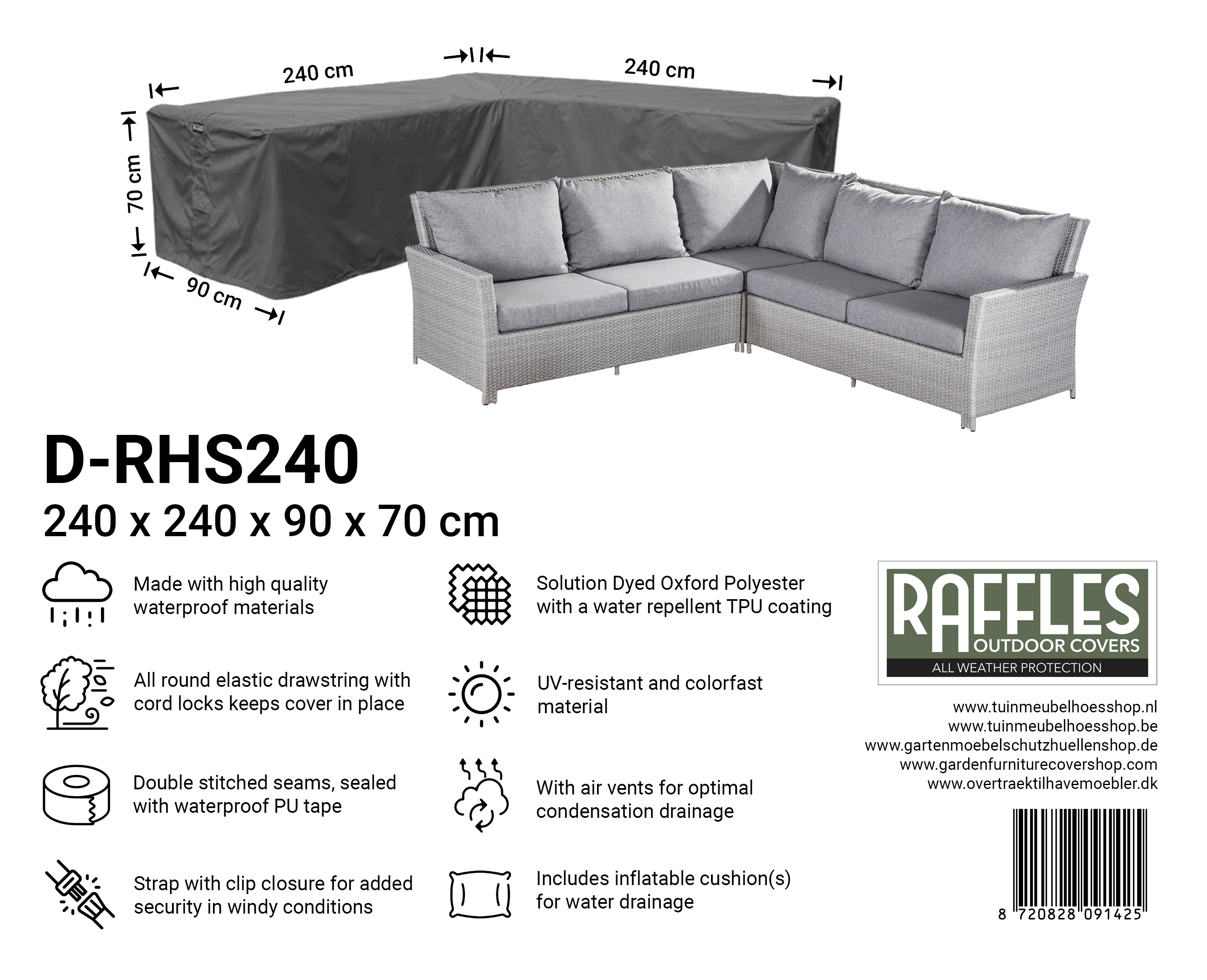 Met de RHS-serie hoekbankhoezen van Raffles Covers beschermt u uw lounge hoekbank of loungeset in L-vorm, van compact tot XXL, het hele jaar door. Of de hoekbank nu op het terras, balkon, onder een overkapping of in de open tuin staat: uw set blijft beschermd tegen regen, vuil, groene aanslag en zon.