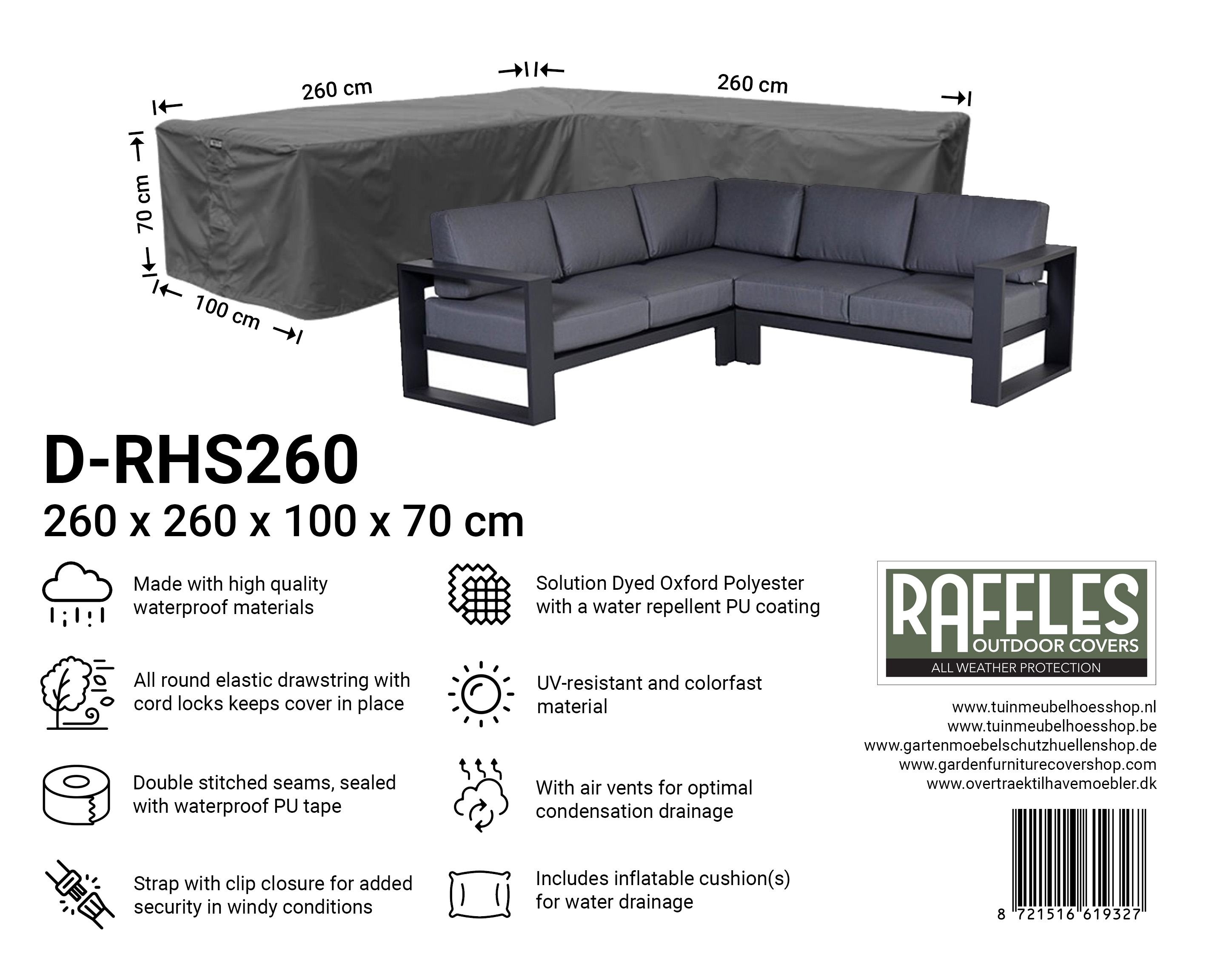 Met de RHS-serie hoekbankhoezen van Raffles Covers beschermt u uw lounge hoekbank of loungeset in L-vorm, van compact tot XXL, het hele jaar door. Of de hoekbank nu op het terras, balkon, onder een overkapping of in de open tuin staat: uw set blijft beschermd tegen regen, vuil, groene aanslag en zon.