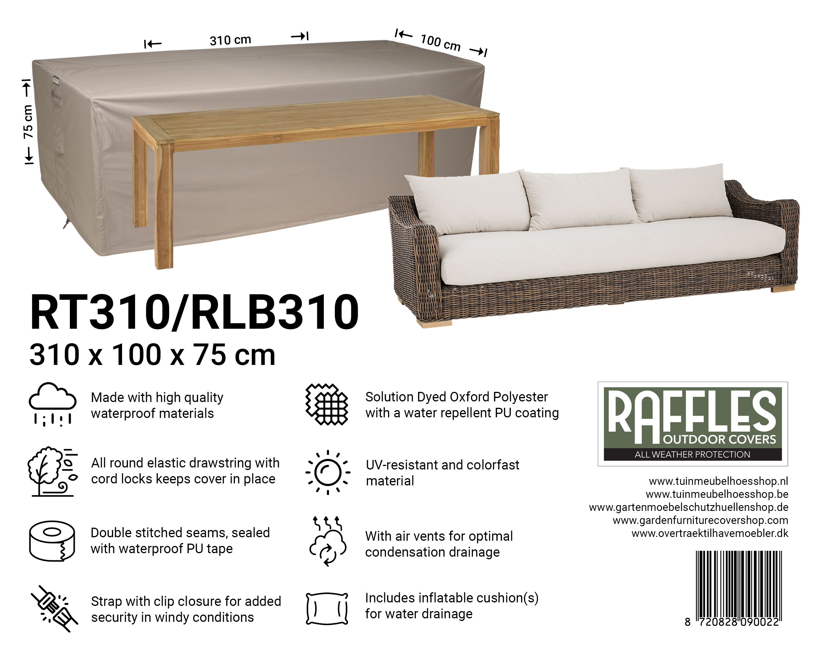 Met een Raffles Covers tuintafelhoes uit de RT-serie kiest u voor doordachte, duurzame en stijlvolle bescherming van uw tuintafel, zodat u in elk seizoen zorgeloos van uw tuin en terras kunt genieten.