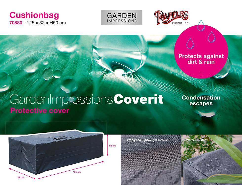 De opbergtassen van CoverIt zijn gemaakt van RipStop Polyester met PU-coating. Dit materiaal is sterk en licht, water- en weerbestendig, vuil- en schimmelwerend. Condensvorming is mogelijk. Om te voorkomen dat door verstikking en condensvocht uw tuinkussens beschimmelen, adviseren wij een Pingi XL-luchtontvochtiger te gebruiken. Nooit uw tuinset, parasol, BBQ of kussens nat af dekken. Hierdoor kan schimmel ontstaan.