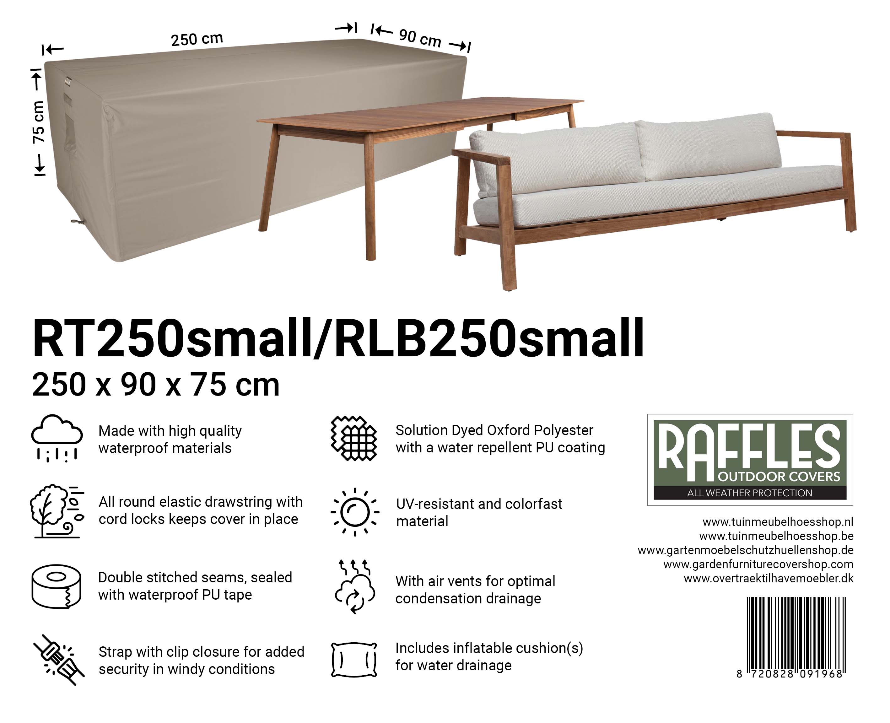 De RT250small tuintafelhoes valt iets kleiner door de afgeronde hoeken. Houd daarom altijd rekening met een speling van vijf centimeter in de lengte of breedte. Deze hoes is geschikt voor tuintafels met een maximale afmeting van 250 x 85 cm of 245 x 90 cm.
